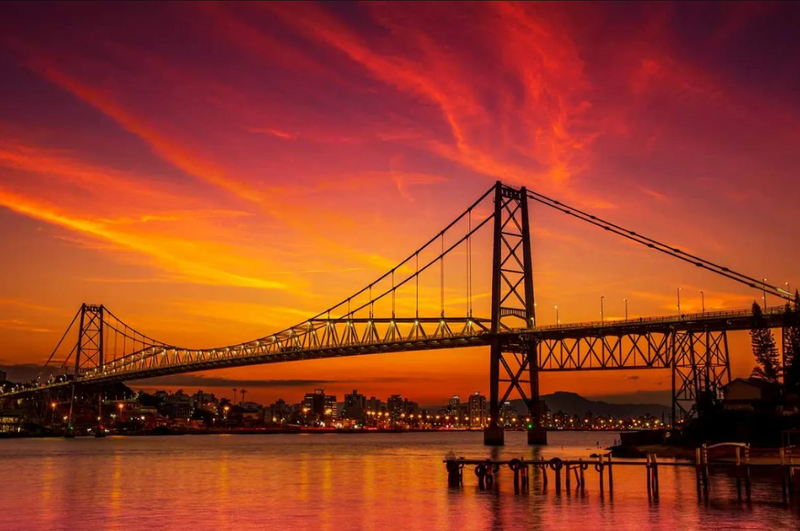 Passeio na Beira‑Mar Norte: ciclovia e calçadão arborizado com vista da ponte Hercílio Luz, perfeito para fotos ao fim da tarde.